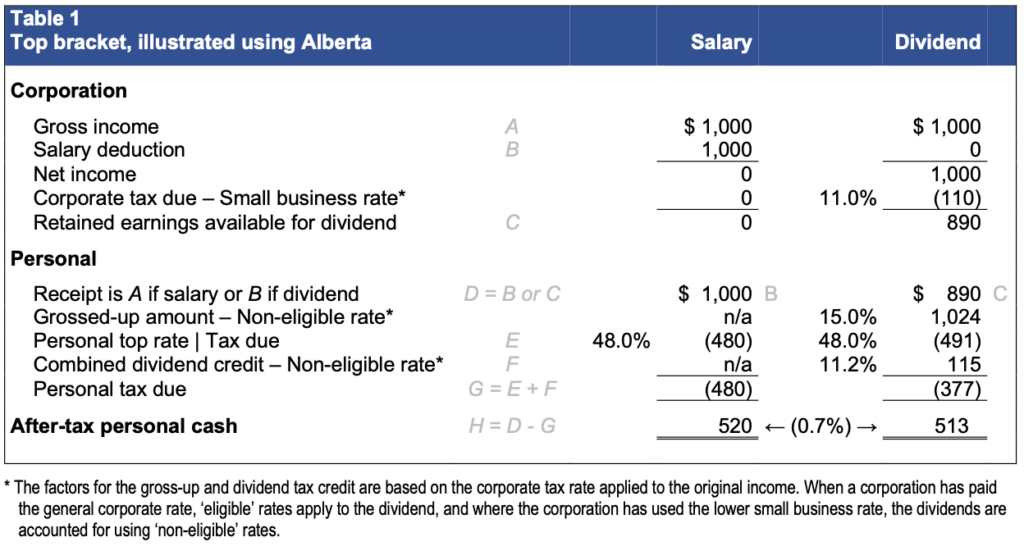 As Table 2 shows, the net tax difference when earning through a corporation then paying a shareholder dividend is negative 1.7% to positive 0.7% as compared to paying a salary to that same person as an employee. While this is not the whole story, the small difference in result emphasizes that tax alone should not be the determinant whether to incorporate.