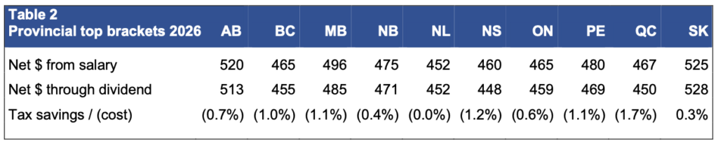The gross-up is the same for all provinces, as is the federal tax credit. The provincial tax credit varies by province. Table 2 shows the net after-tax personal cash for all provinces at top bracket, showing for example the final row H from Table 1 as the Alberta column in Table 2.