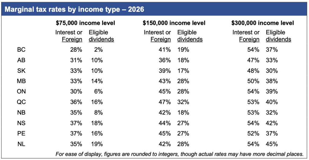 This following table shows the combined federal-provincial marginal rates for a dollar of income, without breaking over bracket thresholds. Figures are rounded to integers for ease of relative comparison of the income types, though actual rates may have more decimal places.